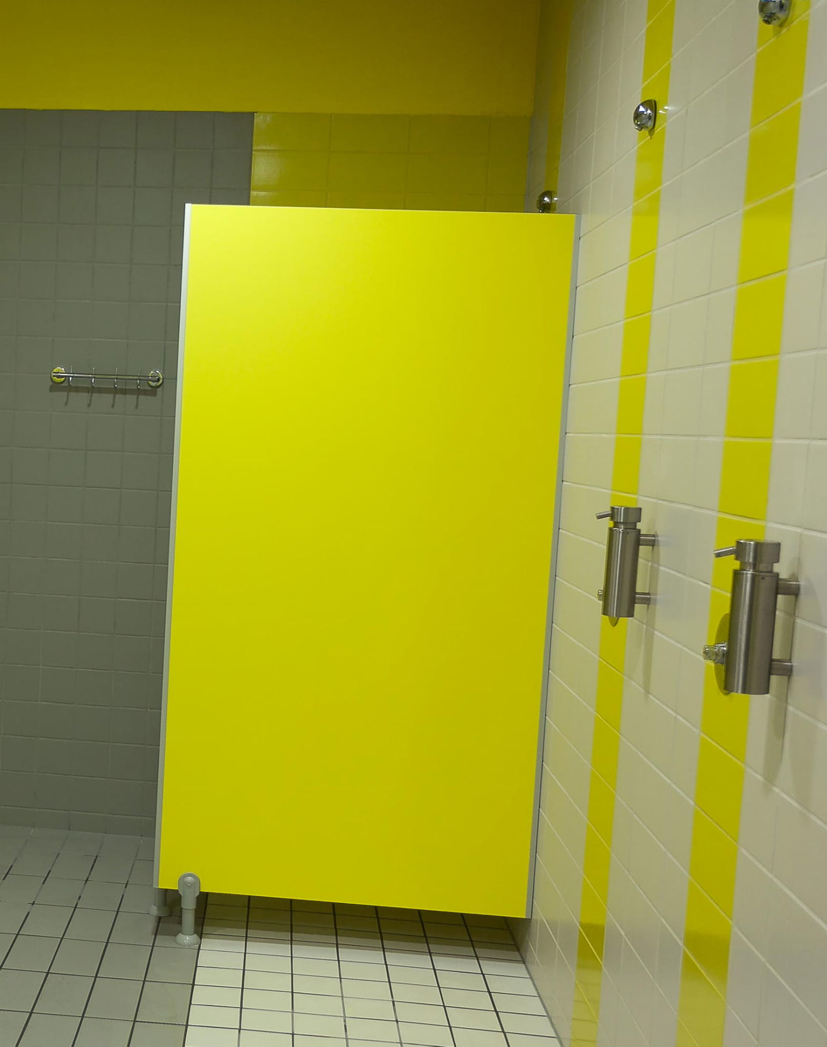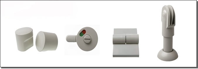Ściany kabin wykonane z płyty HPL, w kolorach wg wzornika producenta. Elementy łączone ze sobą profilami z aluminium anodowanego. Ścianki działowe oraz przymyki boczne przymocowane do ścian za pomocą profili aluminiowych anodowanych. Konstrukcja wsparta na systemowych nóżkach z aluminiumu.