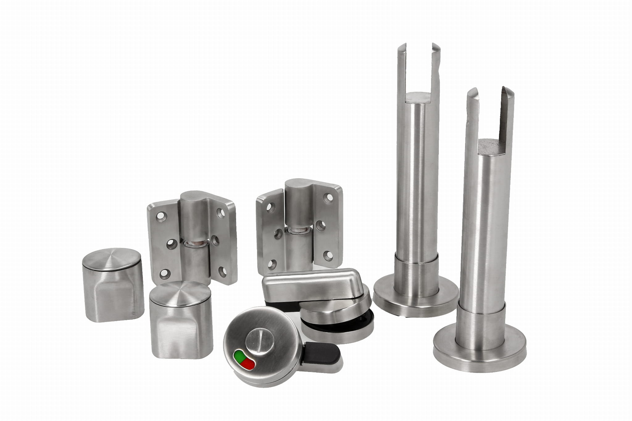 Zestaw okuć (do płyty o grubości 10-13 mm) umożliwiający zamontowanie 1 drzwi do kabiny sanitarnej WC.