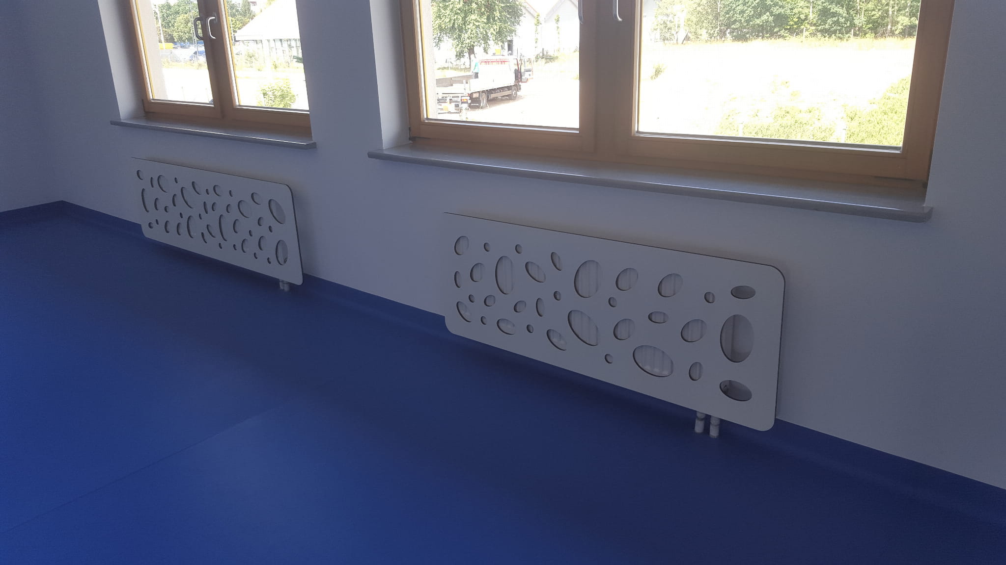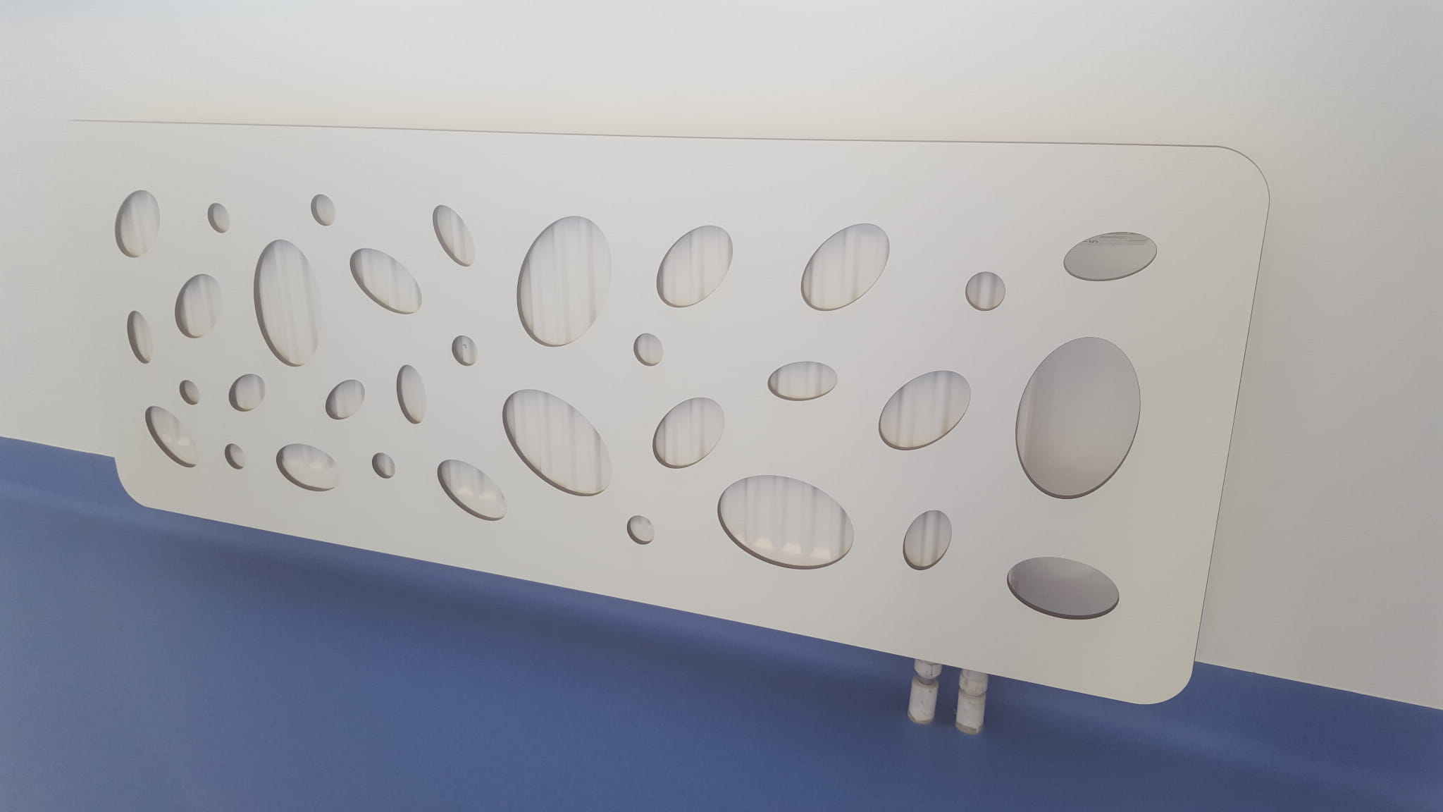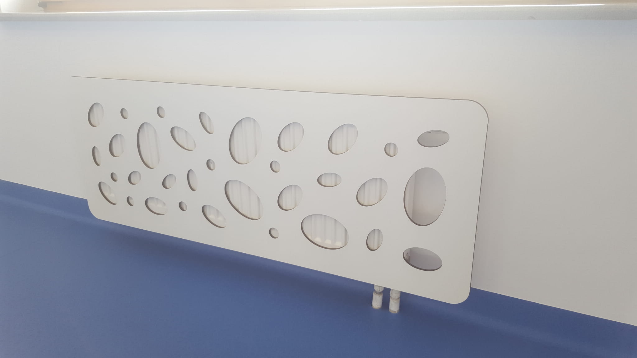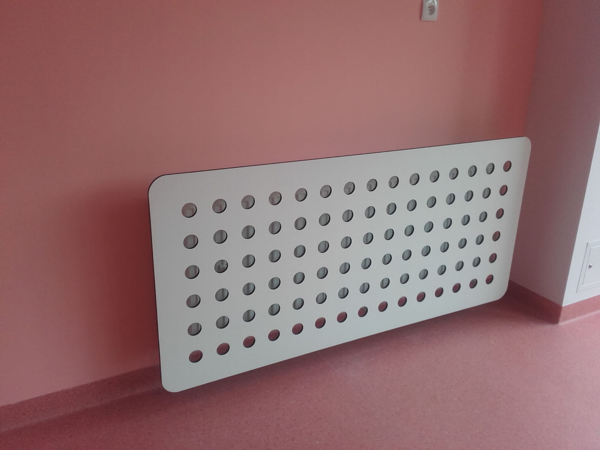 Osłona grzejnika wykonana z płyty kompaktowej HPL. Płyta nie blokuje przepływu powietrza, łatwa w utrzymaniu czystości, odporna na mechaniczne działania niszczące. Możliwość wyboru koloru płyty oraz kształtów i rozmieszczenia otworów z gotowych rozwiązań oraz wg. projektu klienta. Rdzeń płyty widoczny w kolorze brązowym lub czarnym. Standardowe wymiary osłon dopasowane do standardowych wymiarów grzejników.
