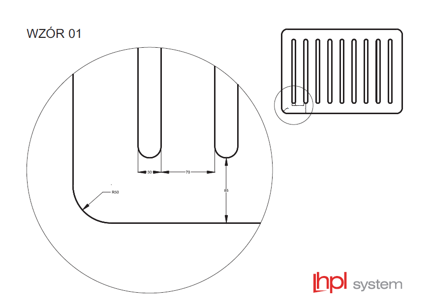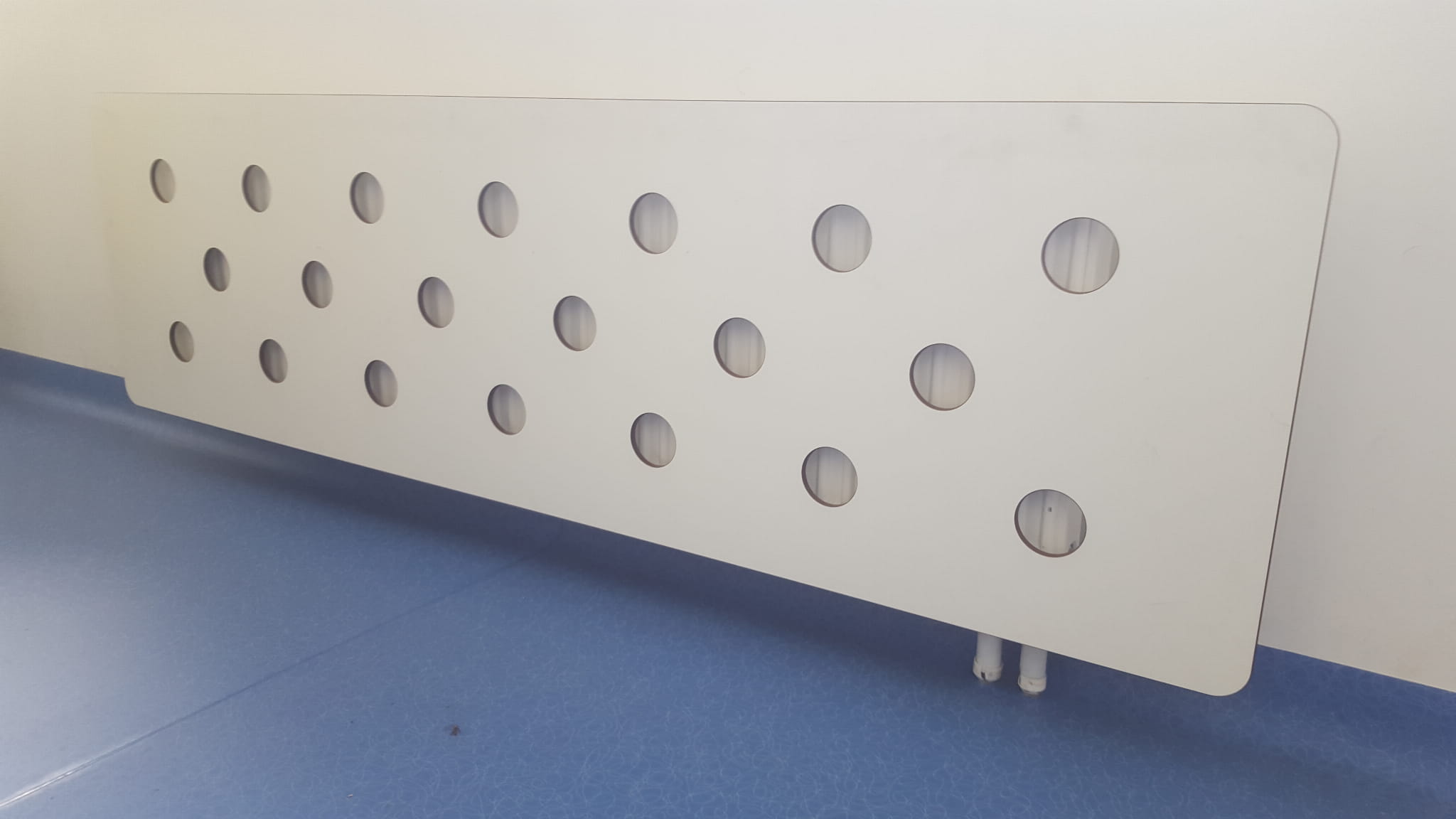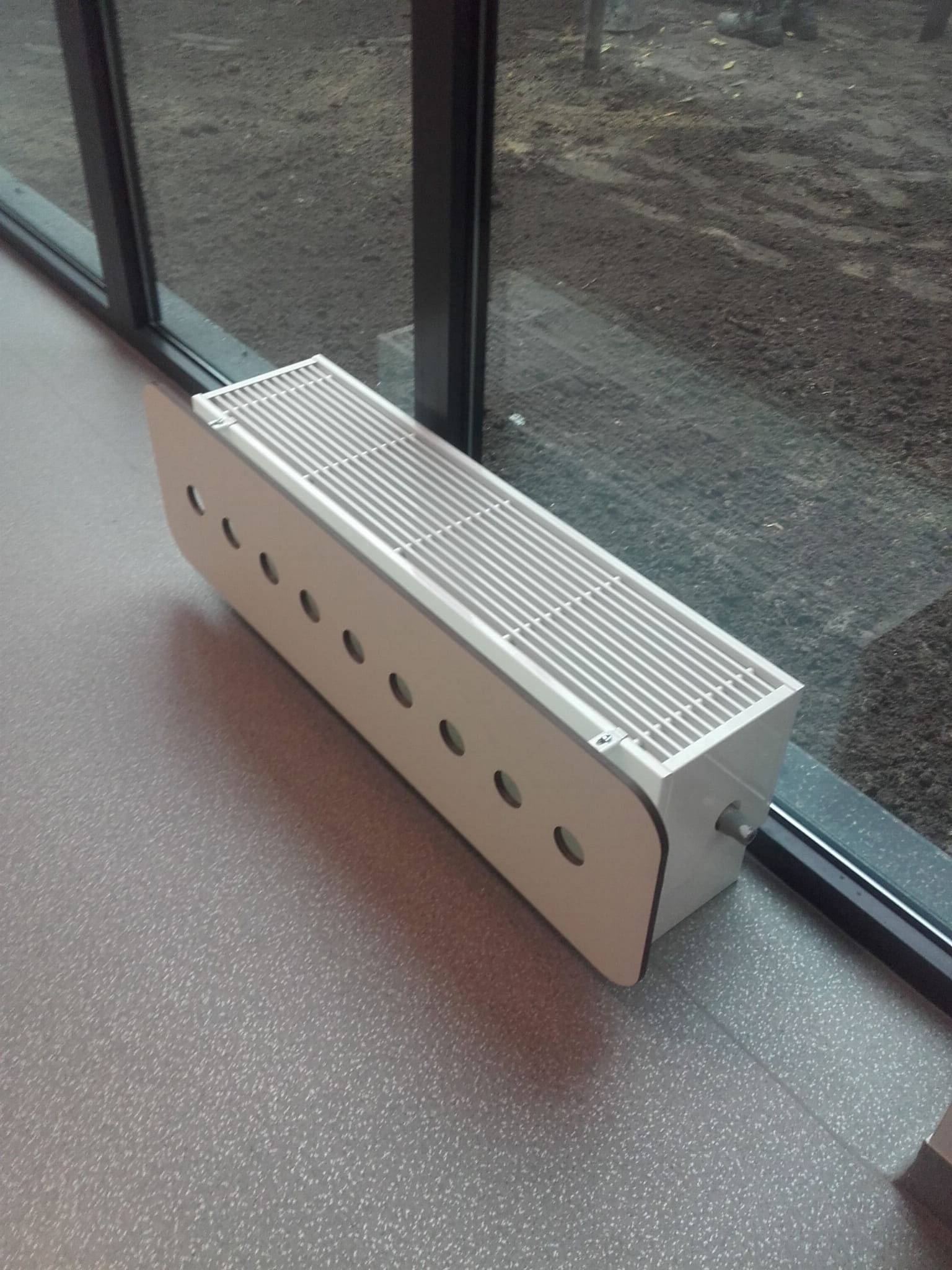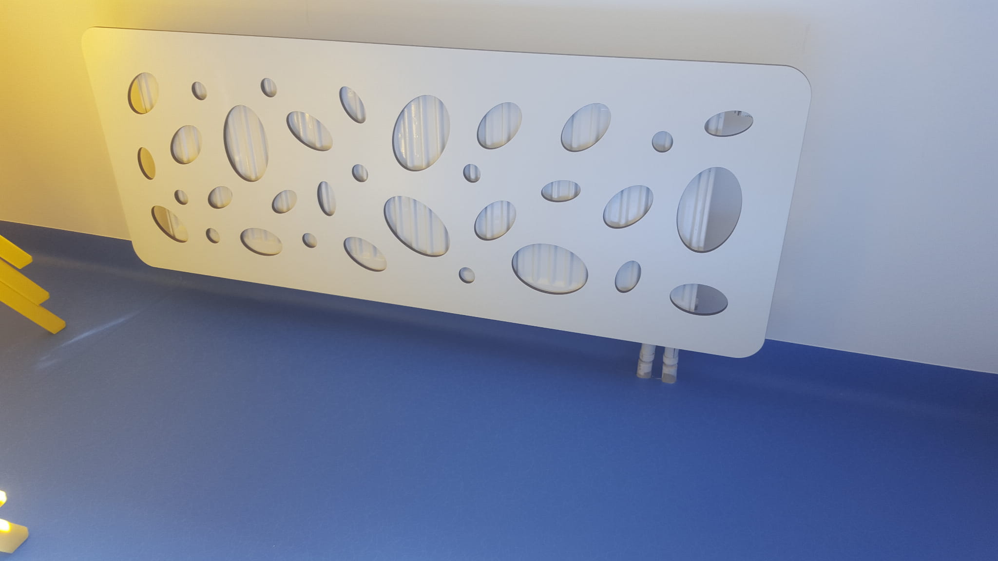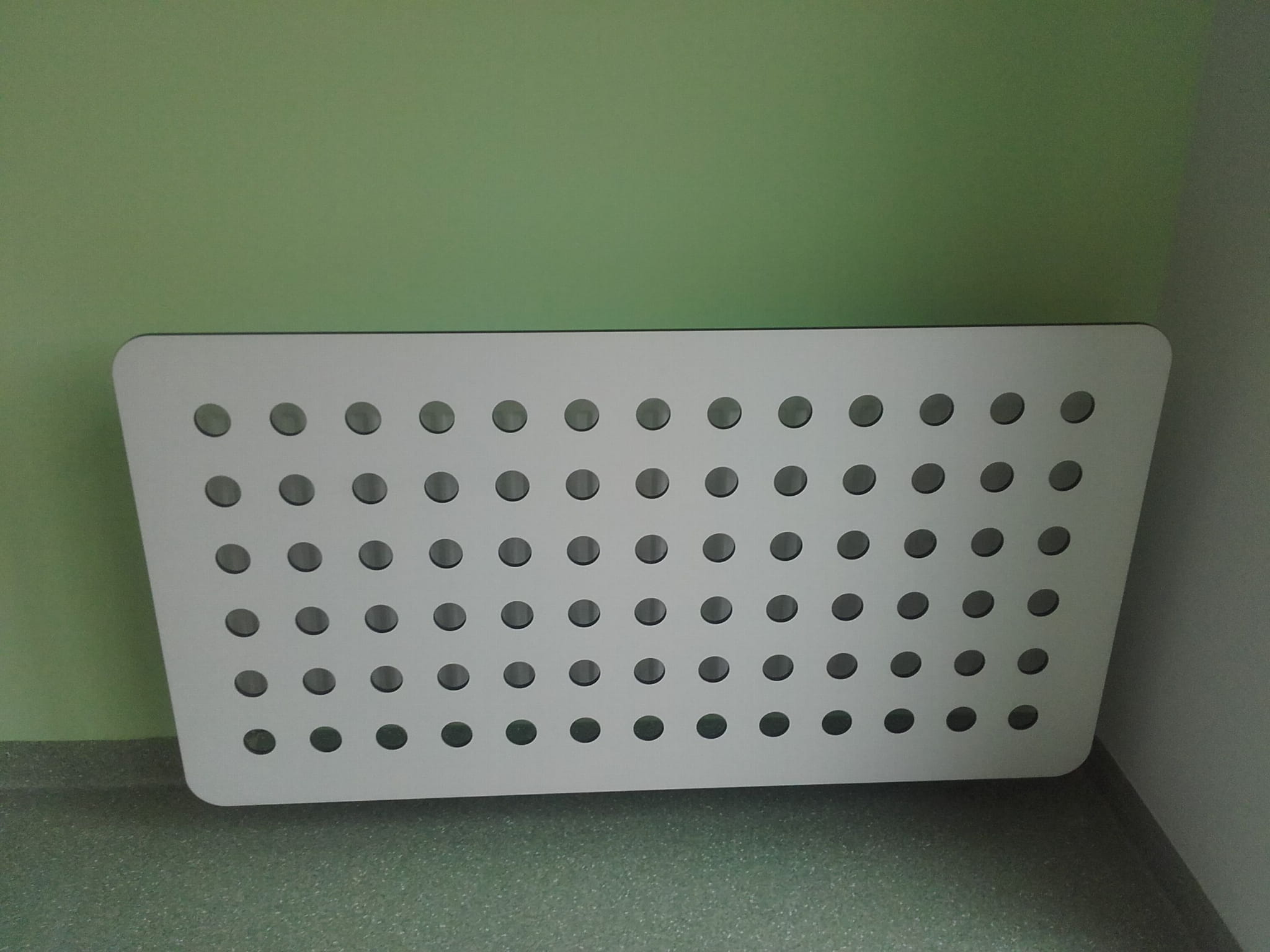 Osłona grzejnika wykonana z płyty kompaktowej HPL. Płyta nie blokuje przepływu powietrza, łatwa w utrzymaniu czystości, odporna na mechaniczne działania niszczące. Możliwość wyboru koloru płyty oraz kształtów i rozmieszczenia otworów z gotowych rozwiązań oraz wg. projektu klienta. Rdzeń płyty widoczny w kolorze brązowym lub czarnym. Standardowe wymiary osłon dopasowane do standardowych wymiarów grzejników.