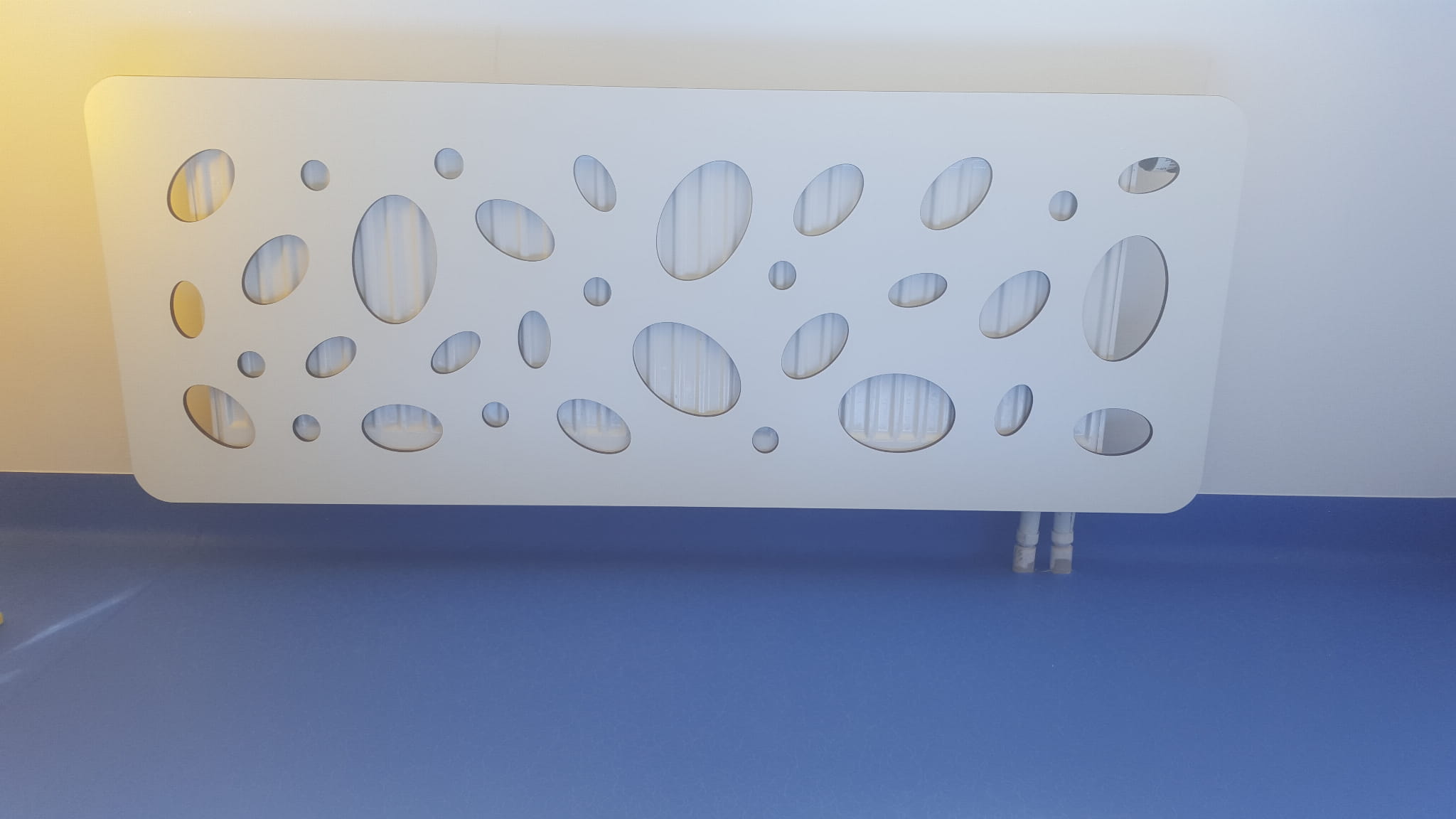 Ażurowa osłona ma za zadanie maskowanie frontu lub frontu i boków grzejnika. Jest wykonana z trwałej płyty HPL grubości 10mm i 12mm zgodnie z kolorystyką producenta. Osłona mocowana jest za pomocą systemowych wieszaków bezpośrednio na grzejniku.